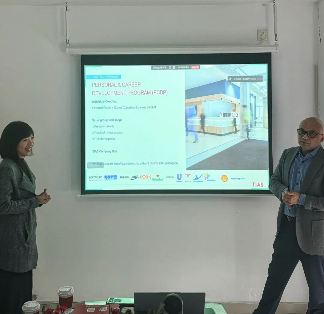 活动现场,嘉宾围绕学子最关心的申请问题展开深度分享,从专业选择、材料准备到语言要求,逐一拆解申请全流程。学生到校学习之前,Career Office就会开启线上一对一咨询,individual coaching服务贯穿整个学习过程,针对职业发展规划,嘉宾重点介绍了 TIAS 的独特优势:MBA 课程包含两次海外研习、预科的加持使得其非MBA硕士课程亦可接受任何本科专业转读,还可在MBA结束后仅用6个月时间无缝衔接加读一个MscBA学位,学生还可参访欧盟总部及欧洲姐妹校,将理论与实务深度结合。现场互动环节中,学生们踊跃提问,围绕专业适配度、奖学金申请门槛及职业服务细节展开热烈交流。